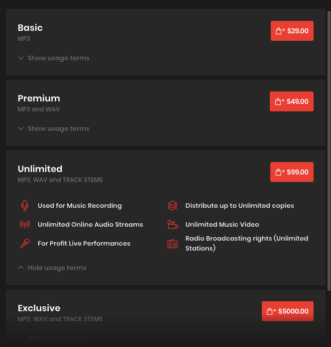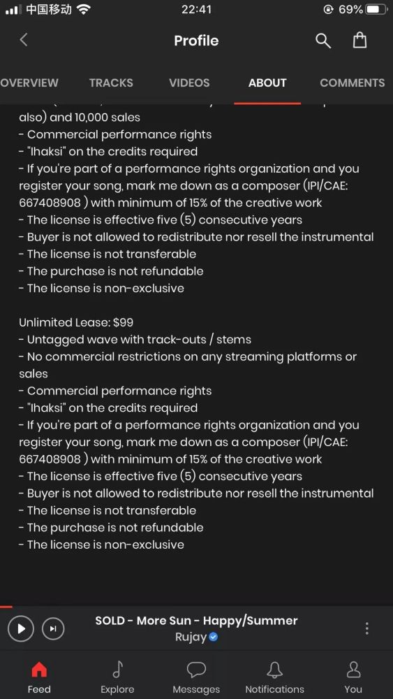 其次,如果宝石Gem没有购买99美元租赁包,那么为何在赵律师的文章中特意展示了99美元的授权租赁包合同?毕竟Ihaksi同时也有着29美元、49美元的授权租赁包,且在BeatStars平台上29美元租赁包中明确写有不得参与商演,如果为了凸显《野狼Disco》用于商业用途的侵权,直接展示29美元租赁包,让平台声明与购买合同相吻合不是更好?还是说特意提前展示出99美元租赁合同就是防止宝石团队的“反转”?