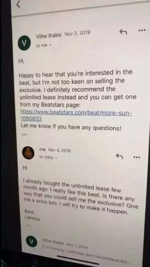 在宝石Gem的回应直播中,他除了出示种种自己购买Beat租赁包的证据外,也对外展示了他与Beat原创者Ihaksi的邮件沟通。在去年11月2日,宝石Gem经纪人曾向Ihaksi发邮件表示想要买断《More Sun》的版权,之后Ihaksi回邮件拒绝了这一请求,随后经纪人又于11月4日再发邮件表达买断的想法,却在11月7日得到了再次拒绝的回复。