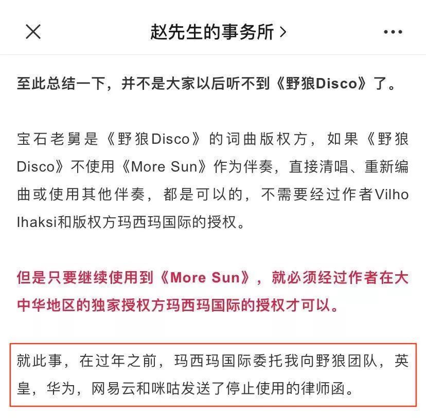 Ihaksi如果真的因被侵权而感到冒犯,大可以直接要求《野狼Disco》停止使用《More Sun》,并要求侵权方道歉;又或者接受被买断的提议,直接用一桶金解决问题,而非选择代理的方式让事情的发展更不可控。