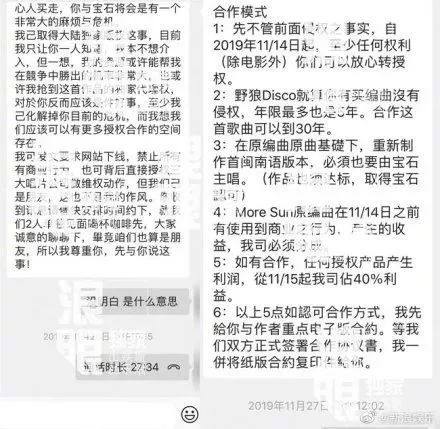 在宝石Gem的经纪人回应中,其给出了某位台湾陈先生与团队的聊天记录,陈先生表示自己抢下了《More Sun》的大陆独家代理权,表明《野狼Disco》的侵权,并提出要与宝石团队合作,合作条件包括以原编曲原曲基础上创作闽南语版本,在11月14日前使用了《More Sun》的《野狼Disco》版本产生的商业收益公司必须分成,若双方达成合作则自11月15日期公司占40%利益。