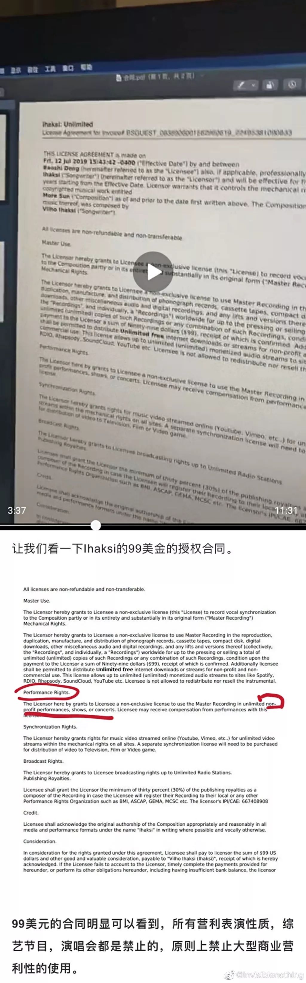 不过矛盾的是,在赵律师文章中展示的合同图片,以及宝石Gem出示的合同图片中,皆写有不得用这个Beat参与商演。售卖平台上的购买声明,与展示出的合同相悖,让我们难以确定究竟是谁的问题,如果宝石Gem真的购买了99美元的租赁包,那么关于目前网络流传的参与商演侵权与否,可能还需要后续双方协商后确定。