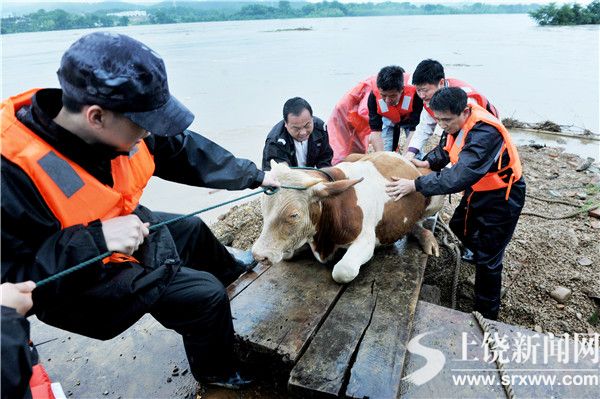 5月23日,德兴市香屯街道办和泗洲镇干群联手出击,将因突涨洪水被困岛上的牛羊营救上船。