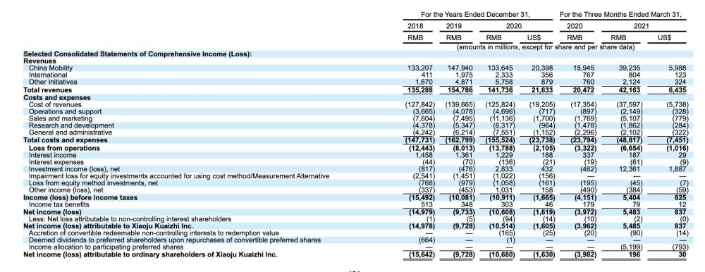 此次上市的主体业务中还有一项其他业务,包括共享单车和电单车、车服、货运、自动驾驶和金融服务等。这一部分在2018、2019和2020年收入分别为17亿元、49亿元和58亿元,2021年一季度为21亿元,目前也处于亏损状态。
