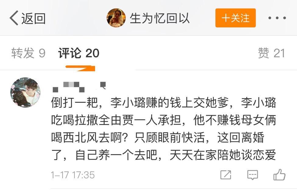 有网友在评论里替贾乃亮打抱不平:“倒打一耙,李小璐吃喝拉撒全由贾一人承担,他不赚钱母女俩喝西北风去啊?”