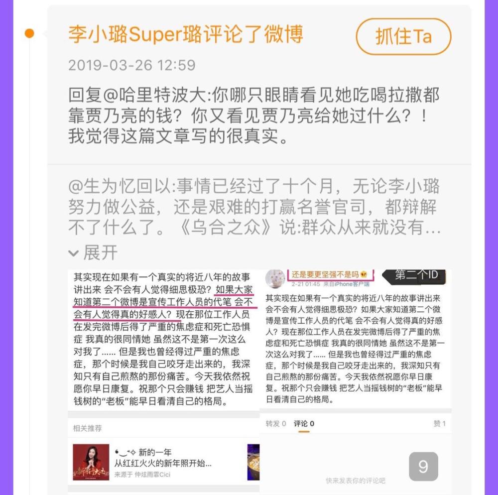 刚刚,某追星软件显示李小璐在一条去年10月发布的微博下留言。该条微博的大概内容是指李小璐为了记录与甜馨的成长点滴特意开设了小号,平日里相当低调,但在贾乃亮生日当天这个小号被推上热搜,暗指是贾乃亮的公关手段,李小璐再一次被打入无尽深渊。