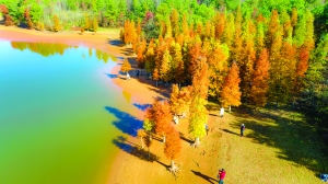 在牛栏坞岭水库边,成片的水杉迎来了一年当中最美的时刻,挺拔的树干、醉人的火红,树影倒映在碧绿平静的水面上,就如一幅五彩斑斓的油画。一排排水杉,粗壮的根部裸露在外,盘根错节,视觉冲击力强,增添了不少艺术感。
