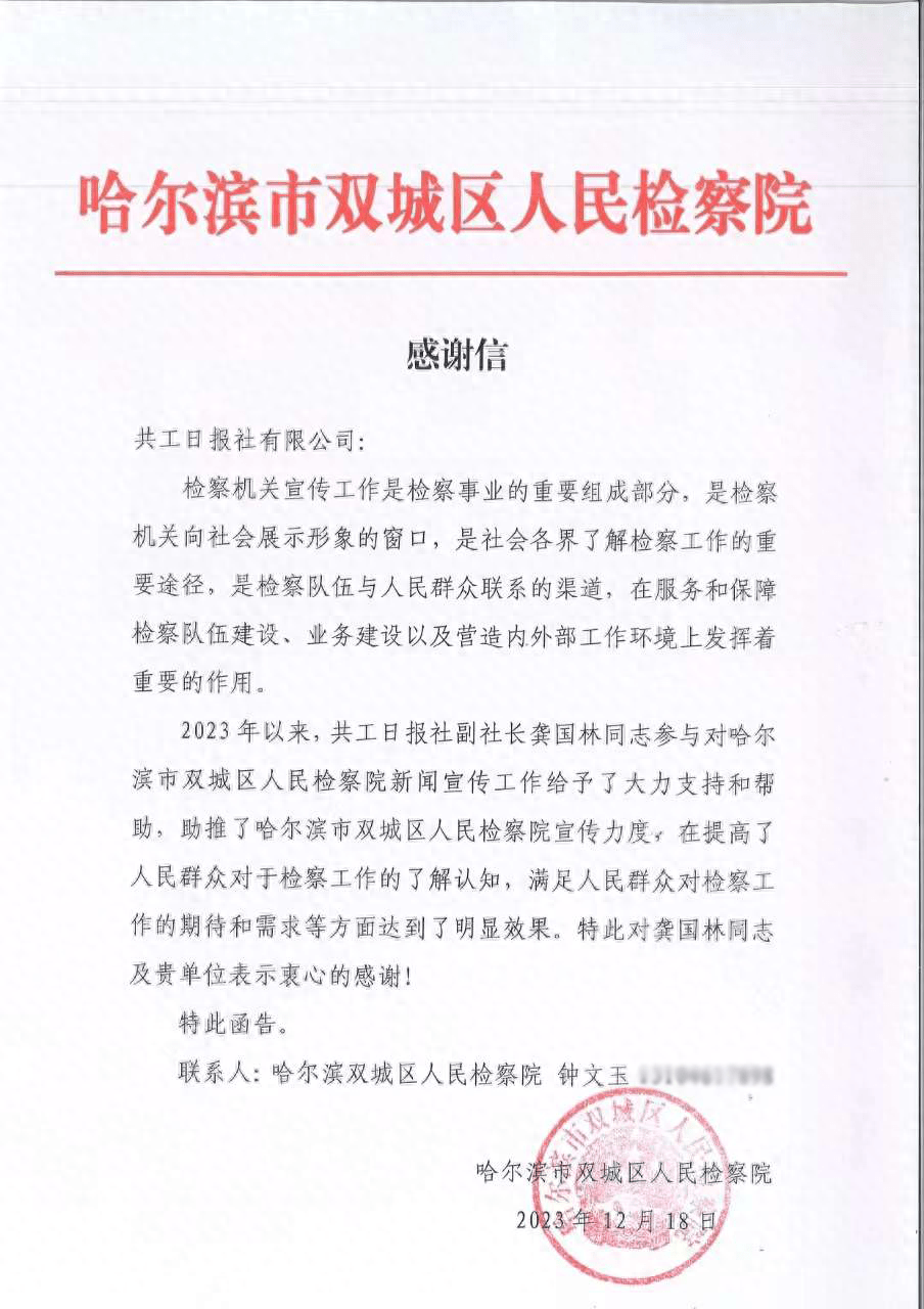 共工日报社专题电(记者 骆闻 朱善永)2023年12月18日,哈尔滨市双城区人民检察院致信共工日报社,书面感谢共工日报社近一年来助推检察院新闻宣传力度,提高人民群众对于检察工作的了解认知。