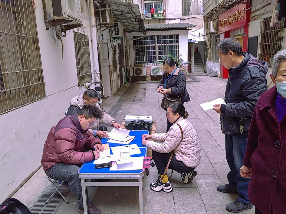 3月8日上午,在信州区解放路八角塘一老小区,上饶市大通燃气工程有限公司市场部工作人员正在小区内给居民讲解开户相关知识。