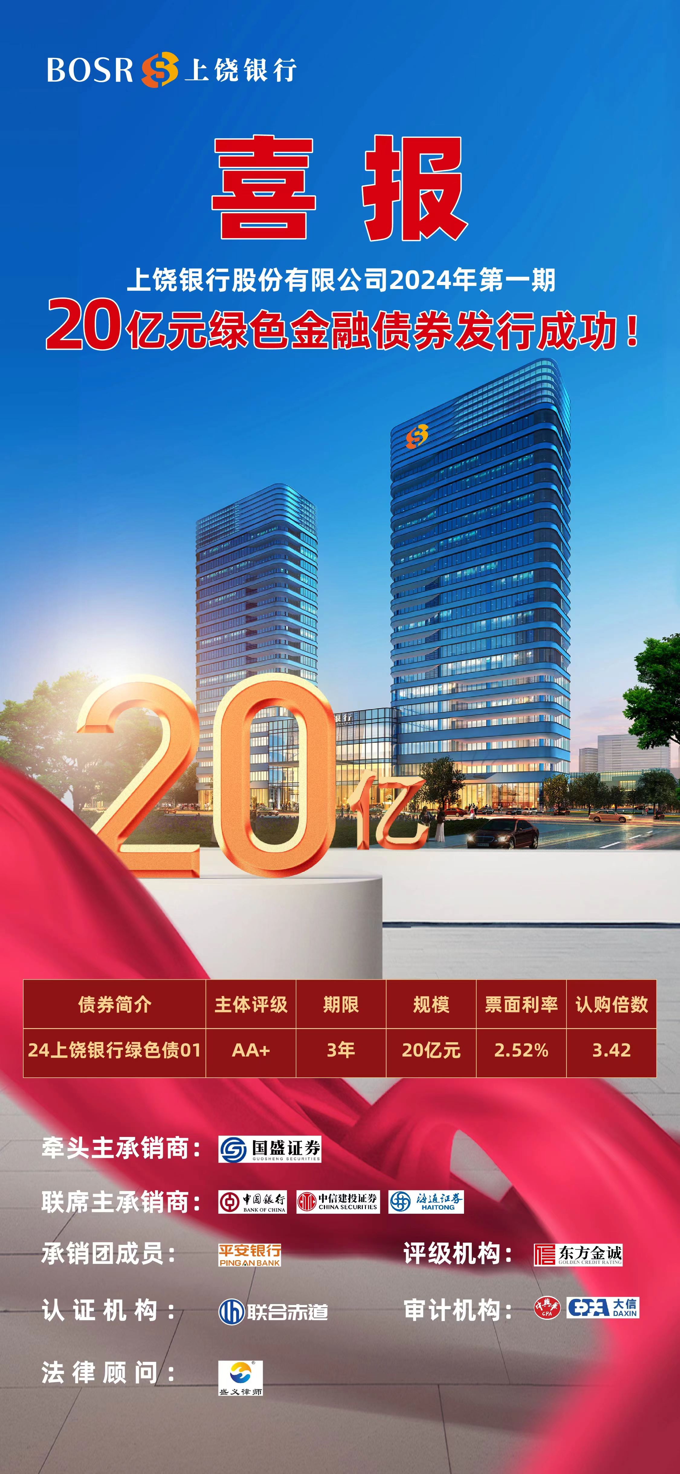 3月11日,上饶银行在银行间债券市场成功发行2024年第一期绿色金融债20亿元,主体及债项评级AA+,期限3年,发行票面利率2.52%,市场反响热烈,吸引了银行、券商、基金各领域投资人参与,全场获得3.42倍的超额认购,发行利率创江西省内法人城商行发债最低利率。