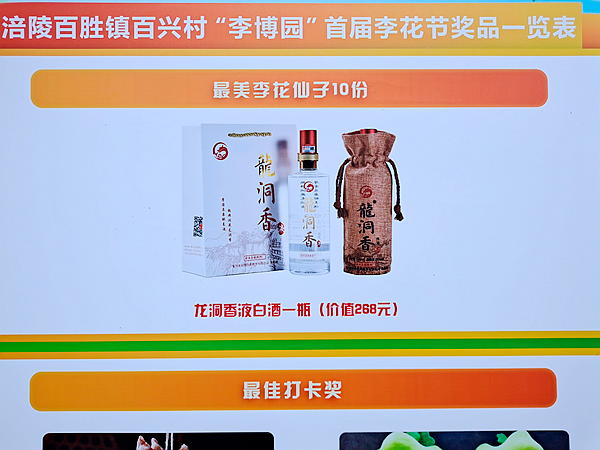 “此次李花节评选的‘最美李花仙子’10人的奖品是由重庆涪陵龙洞香海怡酒类销售有限公司提供赞助的价值268元/瓶的龙洞香·液10瓶。另外还提供了装20斤的精美酒坛3个作为抽奖礼品赞助。”涪陵销售经理刘怡如是说。