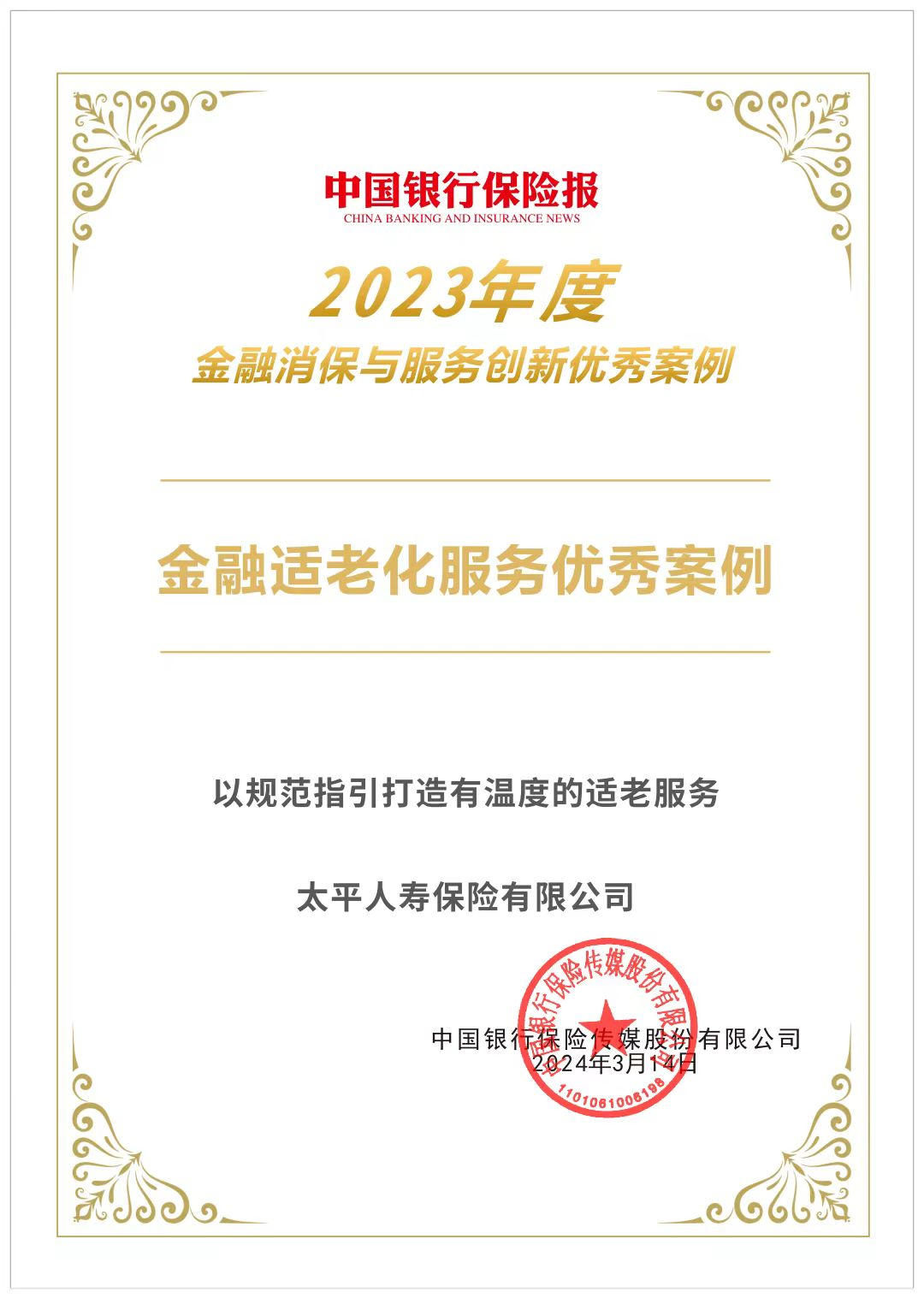 保护金融消费者权益是金融业落实“以人民为中心”思想的重要体现。作为金融央企成员公司,太平人寿秉持中国太平集团“央企情怀、客户至上、创新引领、价值导向”的战略要求,为满足人民群众日益增长的美好生活需求贡献太平力量。此次太平人寿多项服务案例入选“2023年度服务创新案例”,凸显行业、专家对太平人寿高质量保险服务的认可。