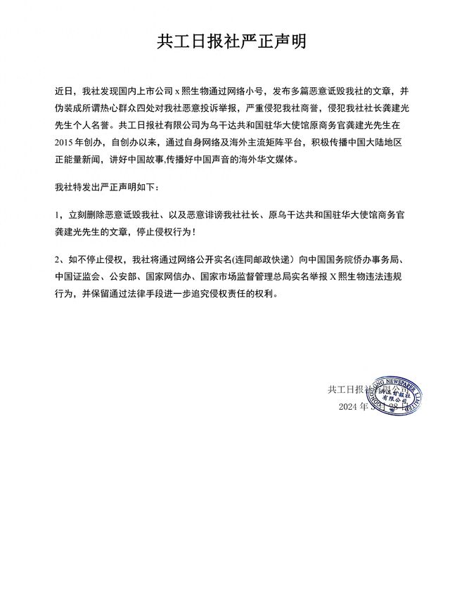 近日,我社发现国内上市公司x熙生物通过网络小号,发布多篇恶意诋毁我社的文章,并伪装成所谓热心群众四处对我社恶意投诉举报,严重侵犯我社商誉,侵犯我社社长龚建光先生个人名誉。共工日报社有限公司为乌干达共和国驻华大使馆原商务官龚建光先生在2015年创办,自创办以来,通过自身网络及海外主流矩阵平台,积极传播中国大陆地区正能量新闻,讲好中国故事,传播好中国声音的海外华文媒体。
