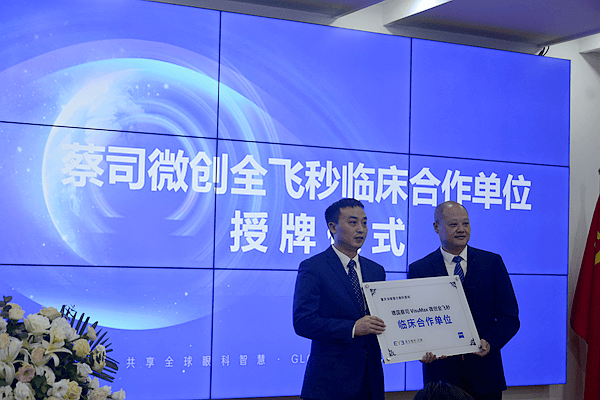 蔡司医疗渝贵区屈光业务发展经理刘春峰为涪陵爱尔眼科医院授予“德国蔡司VisuMax微创全飞秒临床合作单位”牌匾,涪陵爱尔眼科医院张伟CEO接牌。