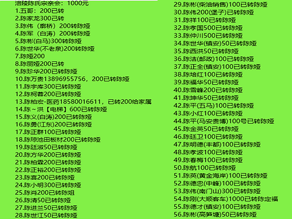 4月26日,陈氏宗亲会在会员群及各大群上发出了“天下陈氏一家亲,命运无情人有情”陈定福的捐款倡议,立即得到了会员们的积极响应。50元、100元、200元、300元、500元、600元、1000元……大家纷纷伸出援助之手接龙筹款,以实际行动汇聚每一颗爱心,帮助陈定福渡过难关。