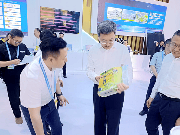 涪陵区委书记王志杰(中),区人民政府区长刘忠(右)亲临展位了解公司新品开发及营销情况,区委书记鼓励公司继续坚持“科创+绿色+”的发展理念,为助力涪陵区乡村振兴,农产品加工业的高质量发展做出新贡献。