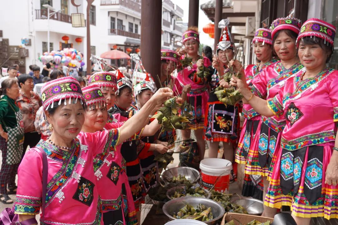 6月8日,在香屯街道兰村畲族村,百名畲族群众身穿“凤凰装”,围着百米长桌一齐包粽子,唱畲歌,跳竹竿舞,以丰富多彩的“畲”味节目迎接端午节。