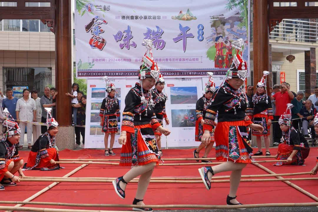 在富有节奏的音乐声中,畲族村民跳起了欢快的竹竿舞,大家观看着特色民俗表演,每个人脸上都洋溢着幸福的笑容,现场气氛十分热烈。端午节被畲族群众称为“五月节”,粽子名为“五节粽”。