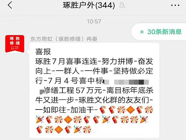 当日,总经理冉晏在琢胜户外群上通报了一个令人激动的消息:公司成功中标价值57万元的涪陵区某一单位修缮工程。一直以来,琢胜修缮的全体员工努力拼搏、奋发向上,始终坚信“一群人,一件事,坚持做必定行”。此次中标,是团队齐心协力、共同奋进的成果,也为实现年底“杀牛目标”增添了强大动力。