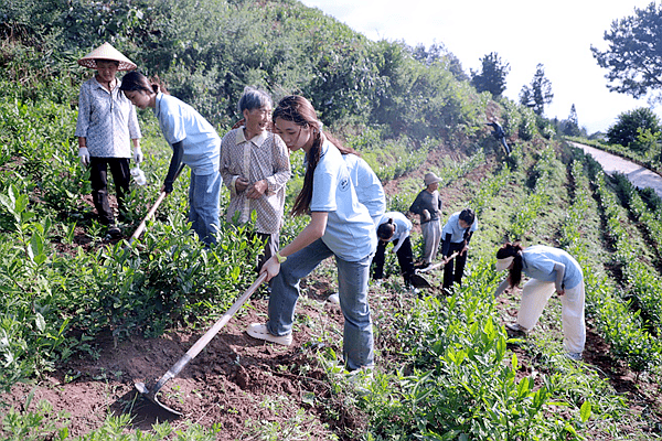 践行团成员积极参与农耕劳作,在茶叶种植基地除草护茶,为患病监测户清理庭院,深刻体悟农民艰辛与乡村变化。他们走访“空巢老人”和“困境家庭”等特殊群体,了解生活状况,提供物资帮助,鼓励树立信心。