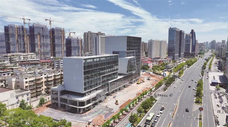 7月22日,广信集团总部经济大厦项目建设现场,车辆穿梭、机器轰鸣,工人们正在忙碌施工。目前,楼主体已全部建设完成,窗户、电梯等已安装完毕,正在对周边道路、绿化工程进行施工,一座广信新地标正加速呈现。