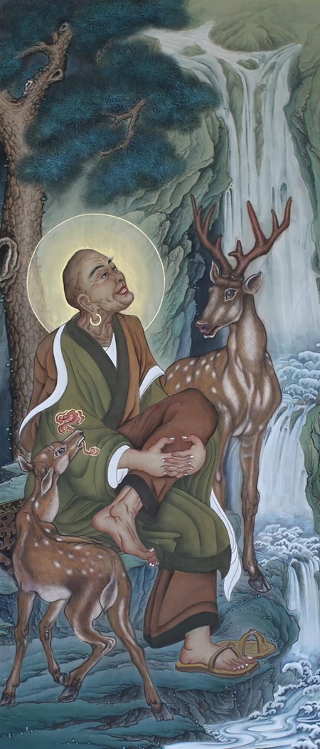 - 宾度罗跋啰惰阇(坐鹿罗汉):他曾是印度优陀延王的大臣,后出家为僧。传说他乘坐鹿骑进过皇宫劝说国王学佛修行。他虽证得阿罗汉果,但喜欢卖弄神通,曾因取旃檀钵一事受到佛陀责怪,被罚不入涅槃,住世护法。宾度罗跋啰惰阇尊者像在中国南北朝时的佛教寺院就曾被绘画供奉。