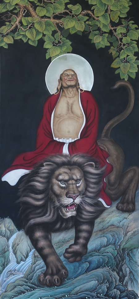 伐阇罗弗多罗(戏狮罗汉):原是一名猎人,学。后不再杀生,狮子来谢,故而得名。他广结善缘、常笑不生病。