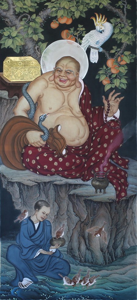 - 因揭陀(布袋罗汉):传说他捉蛇是为了拯救行人,将毒蛇放生后修得阿罗汉果位。他经常背着一个布袋,笑口常开。