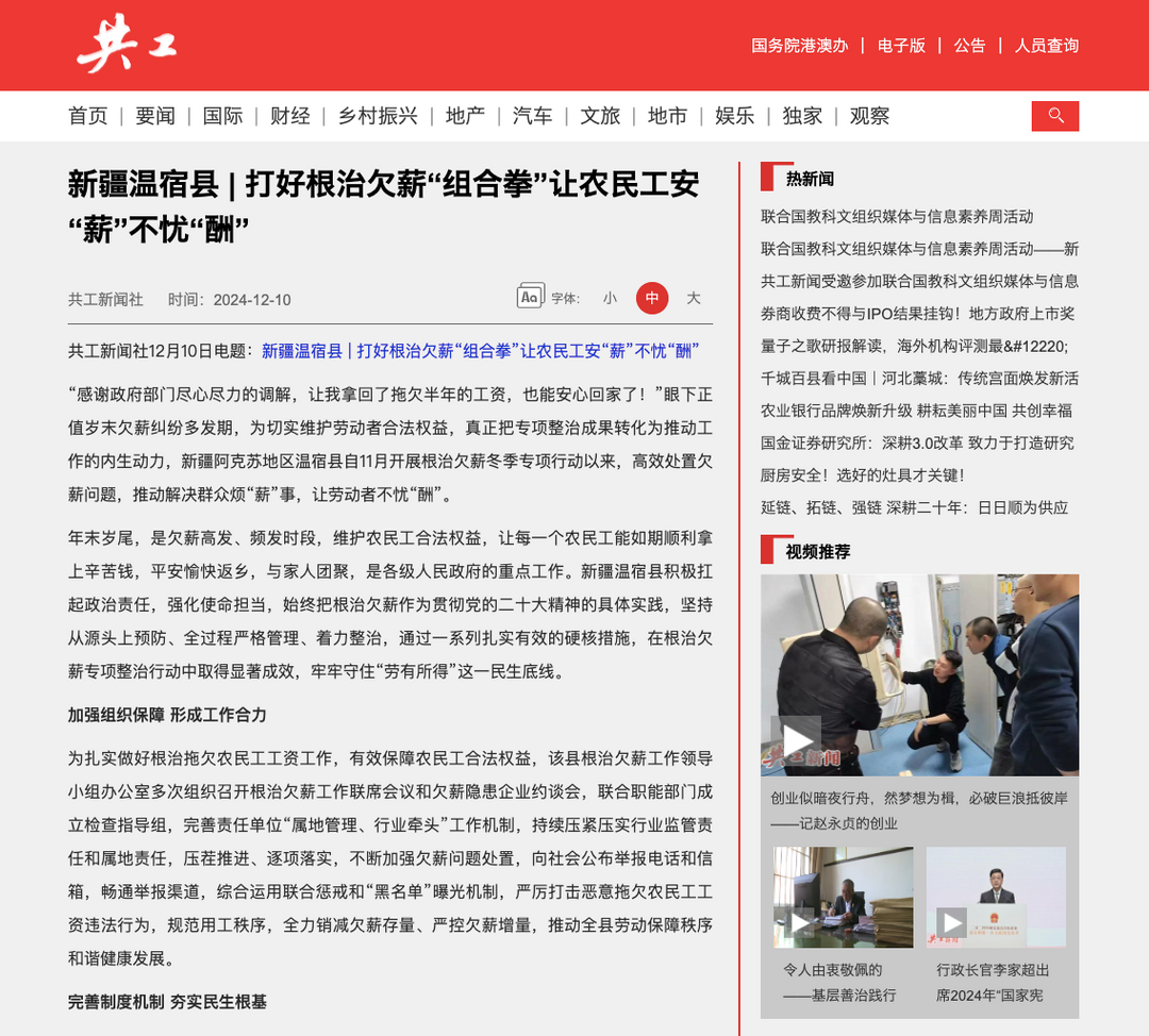2024年12月10日,《共工新闻社》独家频道发表新疆温宿县委组织部副部长,人社局党组书记、副局长杨海东的文章《新疆温宿县 打好根治欠薪“组合拳”让农民工安“薪”不忧“酬”》,可以说是民生事业发展的整治成果转化为推动工作的强大动力文章,信息量很大。