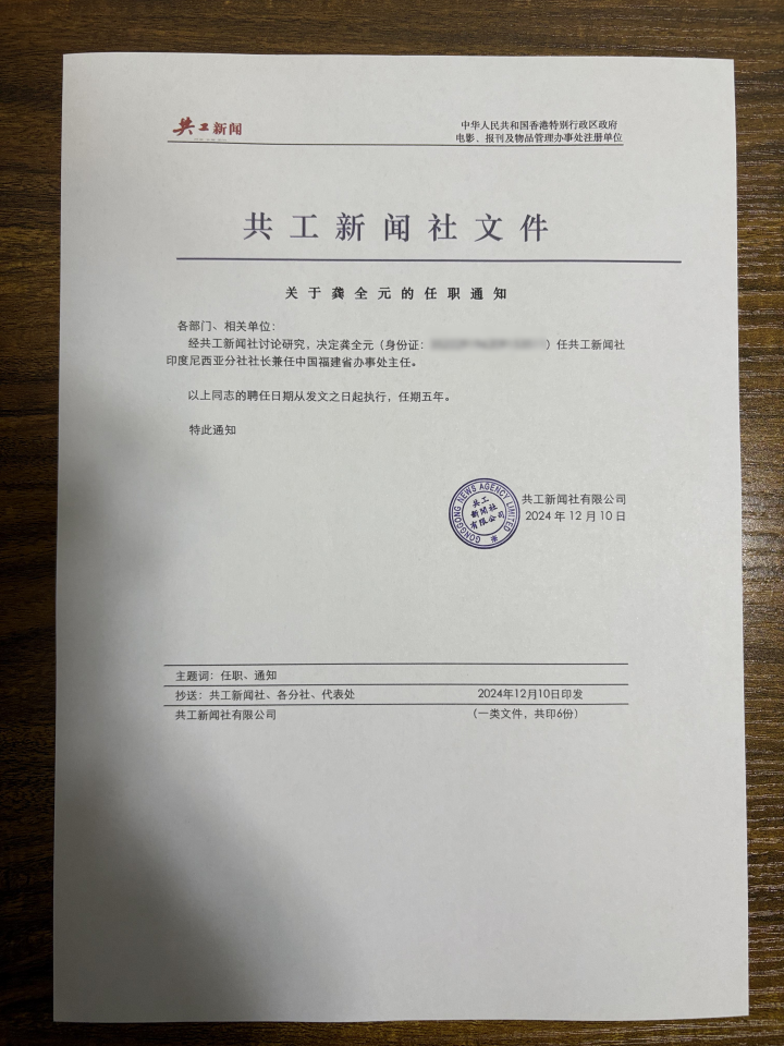经共工新闻社讨论研究,决定龚全元任共工新闻社印度尼西亚分社社长兼任中国福建办事处主任。