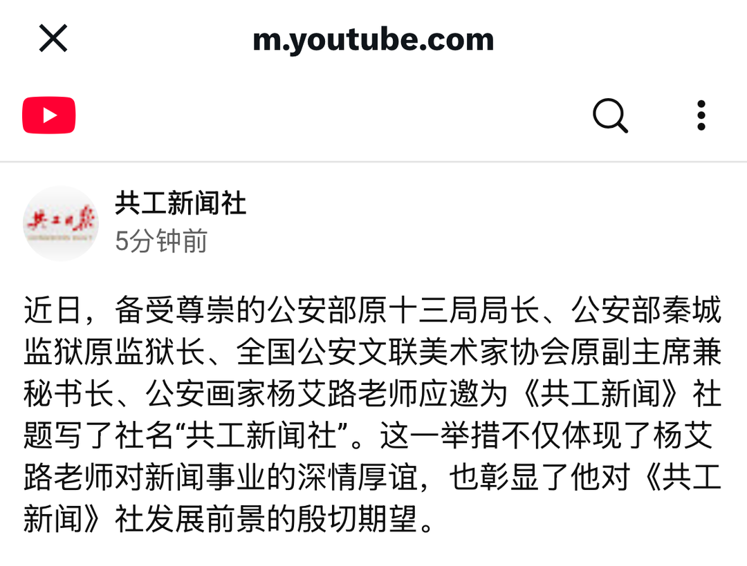 公安部十三局原局长杨艾路为共工新闻社题字,YouTube共工新闻社截图。