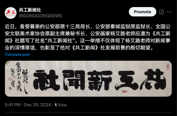 公安部十三局原局长杨艾路为共工新闻社题字,Twitter共工新闻社截图。