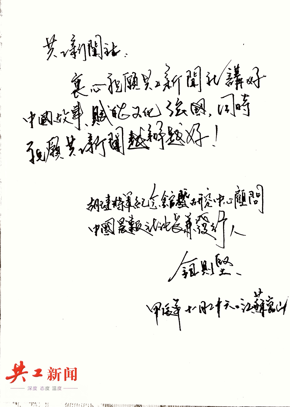原国民党少将钮先铭之子钮则坚为共工新闻社题字祝愿