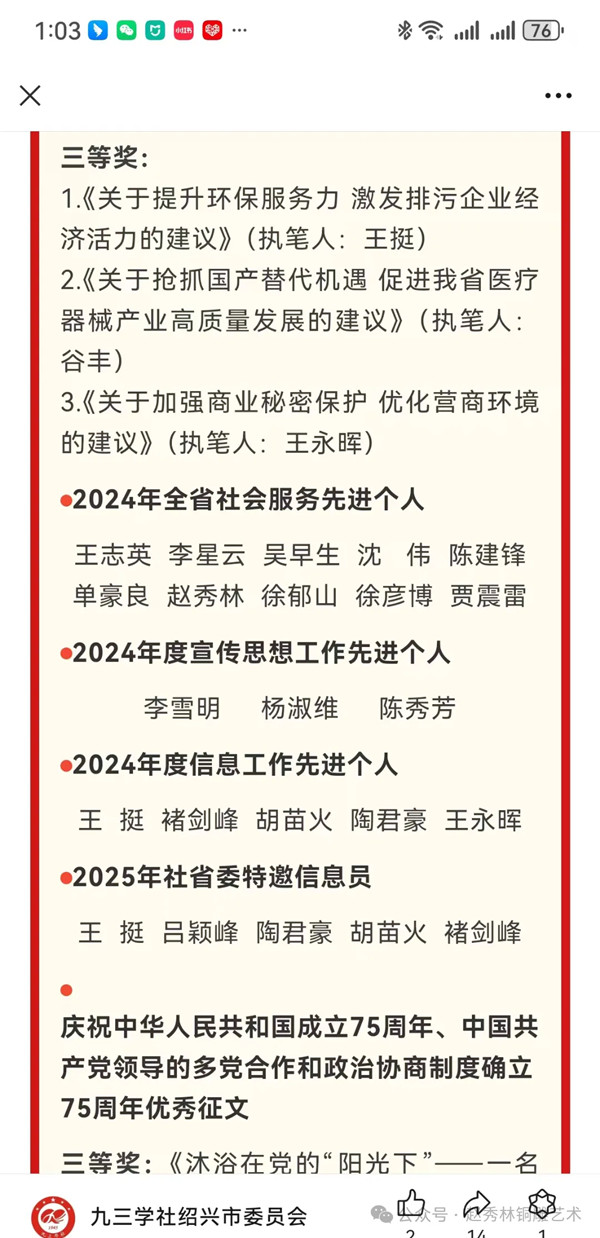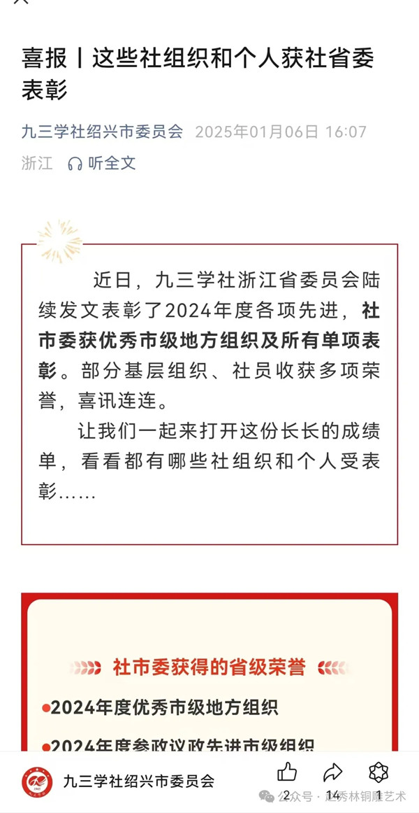 近日,九三学社浙江省委员会发文表彰了2024年度各项先进,九三学社社员、工艺美术大师赵秀林老师荣获“2024年全省社会服务先进个人”称号。