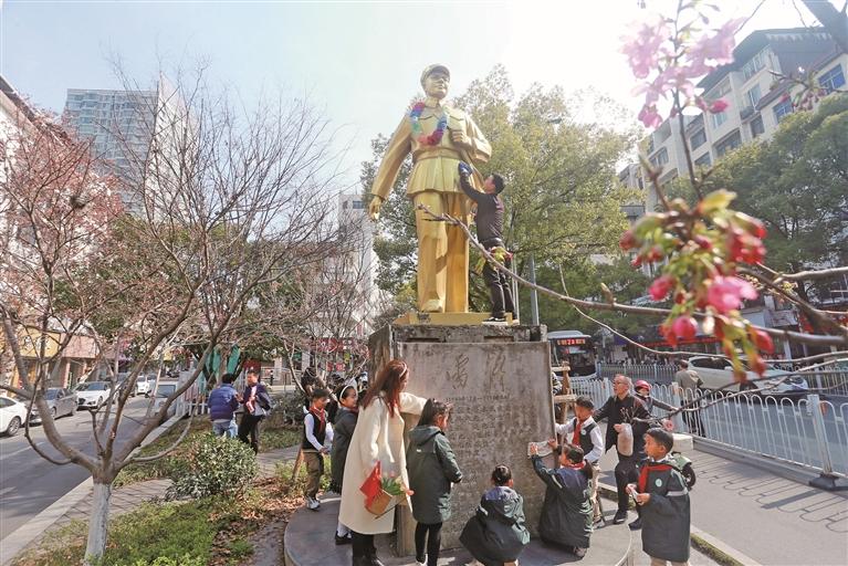 3月5日是学雷锋纪念日,为弘扬雷锋精神,向雷锋致敬,3月1日上午,市带湖小学小桃中队学生在老师的带领下,来到雷锋塑像前开展了以“学习雷锋 争做新时代好少年”为主题的学雷锋社会实践活动。图为大家在清洁雷锋塑像。记者 戴越 摄