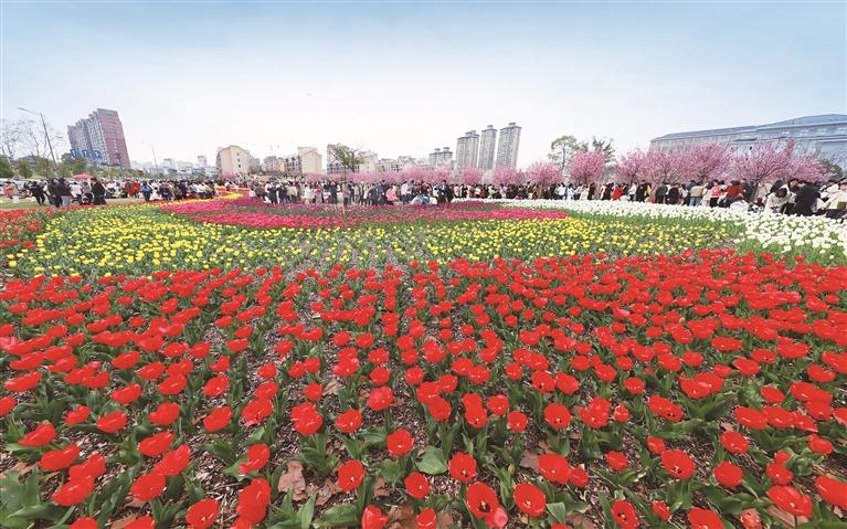 据了解,为创建城区的美好环境,我市城管部门利用道路旁的闲置草坪,精心打造了这一花木基地,春日里,几万株各色郁金香花朵盛开,成为广大群众热门打卡地。
