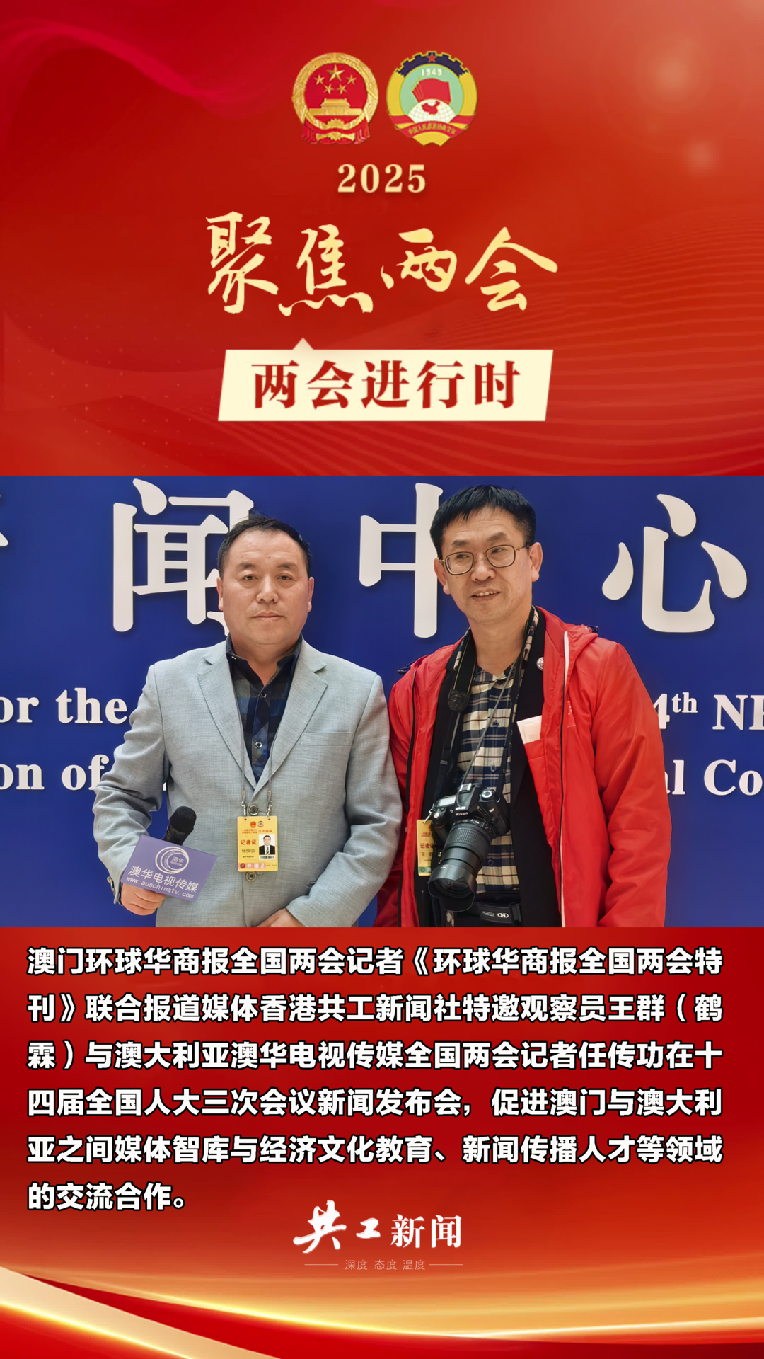 在十四届全国人大三次会议新闻发布会现场,来自不同地区媒体的代表积极互动,为跨区域交流搭建桥梁。澳门《环球华商报》的王群(鹤霖),身兼香港共工新闻社特邀观察员与两会首席新闻评论员等多重身份,与澳大利亚澳华电视传媒的全国两会记者任传功相遇。两人以两会为契机,致力于促进香港、澳门与澳大利亚在多领域的深度交流。