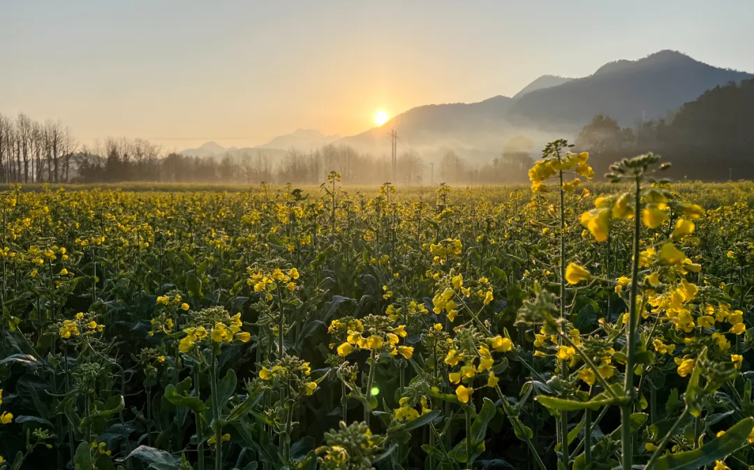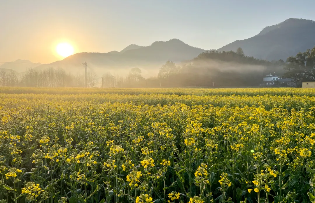 晨曦初照,薄雾如轻纱般在金黄的油菜花海中袅袅升腾,朦胧的光影里,花海若隐若现,与远处墨色如黛的山峦相互映衬,宛如一幅淡雅的水墨画。随着暖阳缓缓升起,柔和的光线倾洒而下,为这片花海披上了一层金色的薄纱。