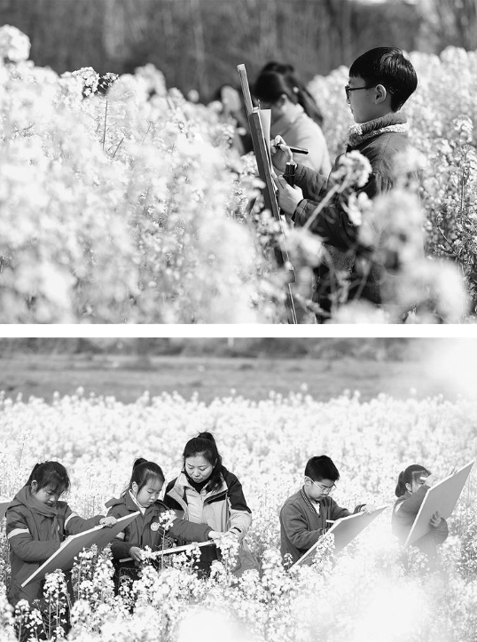 3月22日,余干县第八小学、第九小学开展“走进花海画春天”主题活动,学生走进油菜花田间,开展写生活动,感受春天的气息。