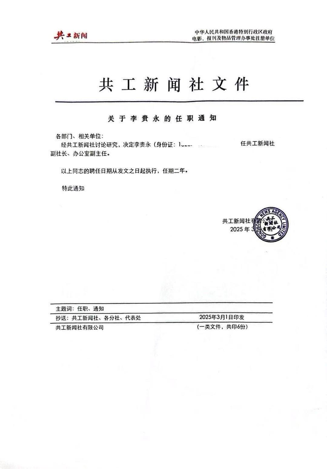 2025年3月1日,经香港共工新闻社总社讨论研究,决定李贵永任共工新闻社副社长兼办公室副主任。