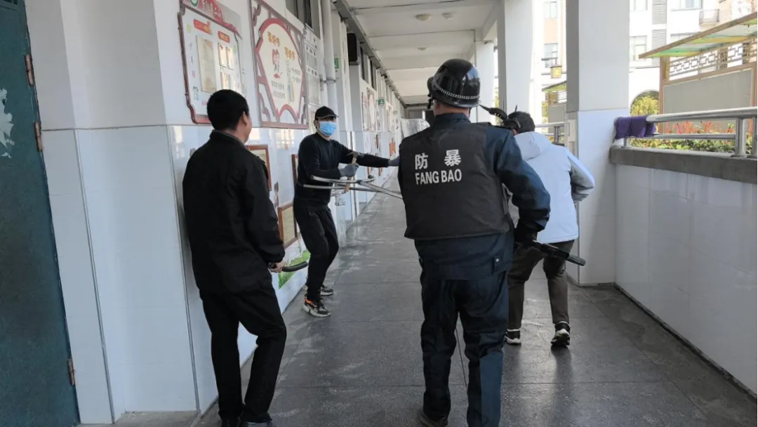 下午2点40分,学生正在进行户外活动,一名模拟的“暴徒”强行闯入校园,想要行凶。安保人员迅速做出反应,立即启动一键报警装置,并手持防暴器械奋力阻挡“暴徒”。