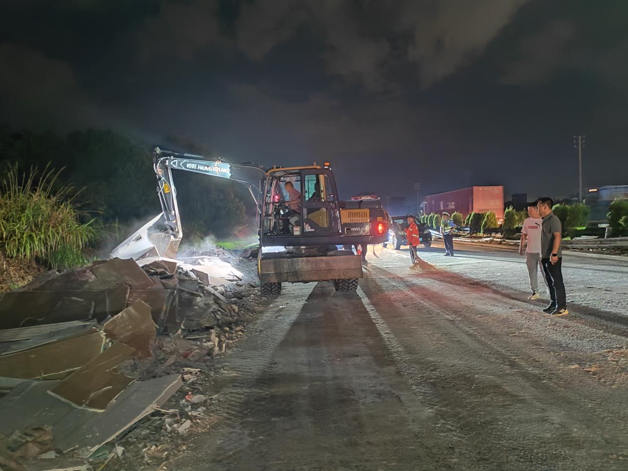 接到交警部门联动通知后,信州公路事业发展中心养护应急队伍迅速响应,组织出动挖掘机1台,养护作业人员5名,安全警示设施若干抵达现场。抵达后,工作人员第一时间与交警部门对接分工,配合交警部门专业清障队伍进行障碍物清理,聚焦“快速清障、恢复通行”,通过挖掘机将路面上散落的货物转移至临时区域,再组织人员用铁锹、扫帚对路面散落的包装碎片、货物残渣进行全面清扫,同时检查路面是否因货车侧翻出现破损,确保清理后的路面符合安全通行标准。