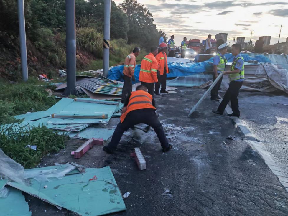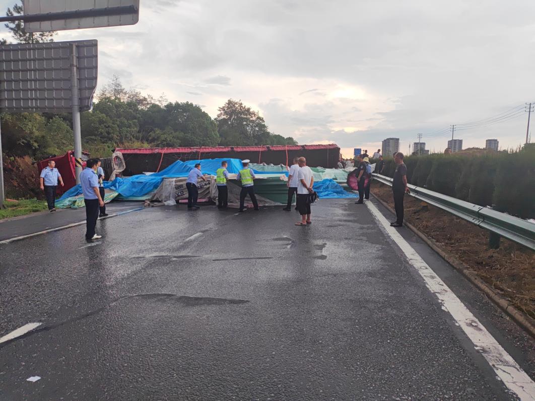 9月8日下午4点30分许,上饶市信州区突发短时强降雨,G320国道广信区往信州区距机场大道路口200米处一辆满载货物的重型货车失控侧翻,车厢内部分货物散落至路面,瞬间造成交通中断,散落的货物还形成了影响后续车辆通行的“移动障碍”,存在二次事故隐患。