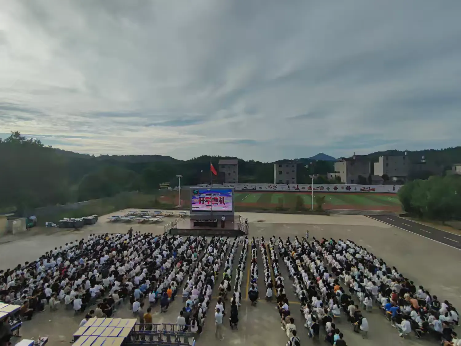 近日,余干县社庚初级中学在操场举行了开学典礼。全体师生列队整齐,以饱满精神共同迎接新学年。现场气氛庄重热烈,展现出积极向上的校园风貌。